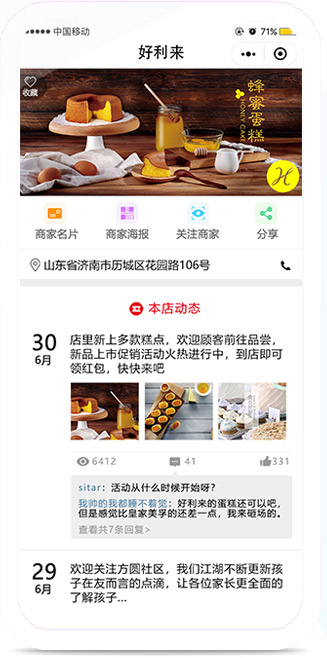 “快荐商家”基础功能包含商家信息展 示、动态发布、活动集客、线上售卖、 营销活动、会员信息收集、美食展示及 专属店铺二维码,商家可根据自身情况 选择适合自己的功能。